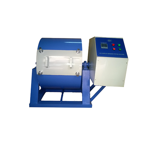As per IS: 10070. For determination of the resistance to wear of small size aggregates and crushed rocks. The machine consists of a hollow cylinder mounted on a sturdy frame on ball bearings. A detachable shelf which extends throughout the inside length of the drum catches the abrasive charge and does not allow it to fall on the cover. The drum is rotated at a by an electric motor through a heavy duty reduction gear. Motor is suitable for. The unit is supplied complete with a tray for collection of the material with abrasive charge.