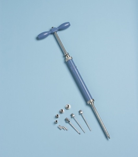 Consists of a body housing a spring, a plunger calibrated to read 0-40 kg x 1 kg and a handle. Complete with needle point set comprising one each of 0.25, 0.5, 1, 1.5, 2, 3.5 & 6 sq. cm & tommy pin. Supplied in a wooden carrying case.